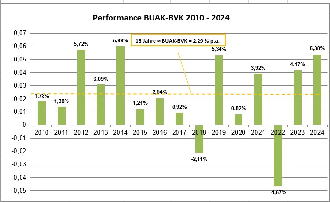 Anbei ein Überblick über die Jahresperformance der BUAK Betrieblichen Vorsorgekasse in den letzten 15 Jahren. Mit einer durchschnittlichen Jahresperformance von 2,29% p.a. konnte die BUAK Betriebliche Vorsorgekasse auch während der Niedrigstzinsphase mit ihrer vorsichtigen Veranlagungspolitik über die Jahre hinweg erfreuliche Erträge für Ihre Abfertigungsbeiträge erwirtschaften.